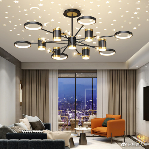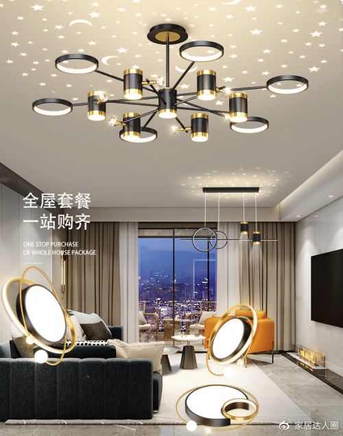 客厅作为集活动与会客为一体的场所,它的地位与家庭的其他地方都不一样,浦仕顿PTHSTON根据家庭的要求大小推出不同设计的产品,如湖流款有圆环形状,根据房间的大小可以搭配大小不一的国环。有“坏坏相扣”之意;也有机械风的黑枝柱形状,不贴合天花板成为悬挂系列,让客厅的氛围呈现出美好生活意义。