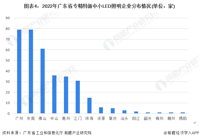 2022年广东专精特新中小LED/照明企业分布在全粤15个城市:广州和东莞分别以79家企业居名单中专精特新中小照明企业所在城市之首,佛山以61家企业位列第三,其后分别是中山36家,惠州35家,江门31家,珠海15家,河源6家,肇庆5家,汕头3家,阳江2家,韶关、梅州、潮州、揭阳各1家。
