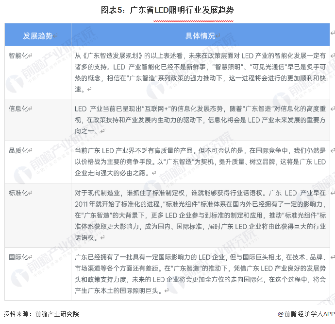 从“制造”到“智造”的转变,对于包括LED产业在内的新兴制造业来说,不仅会带来巨大的发展机遇,也从政策层面预示着产业发展的未来方向。未来广东省LED照明行业发展方向为智能化、信息化、品质化、标准化与国际化。