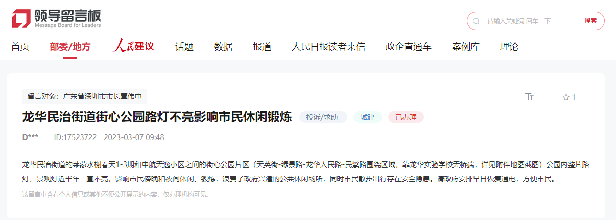 人民网深圳5月6日电(陈育柱、刘森君)近日,有深圳市民在人民网“领导留言板”反映,深圳市龙华区民治街道街心公园(天英街-绿景路-龙华人民路-民繁路围绕区域)内整片路灯、景观灯好久不亮了,影响市民傍晚和夜间休闲锻炼,浪费公共场所资源,还存在一定安全隐患。