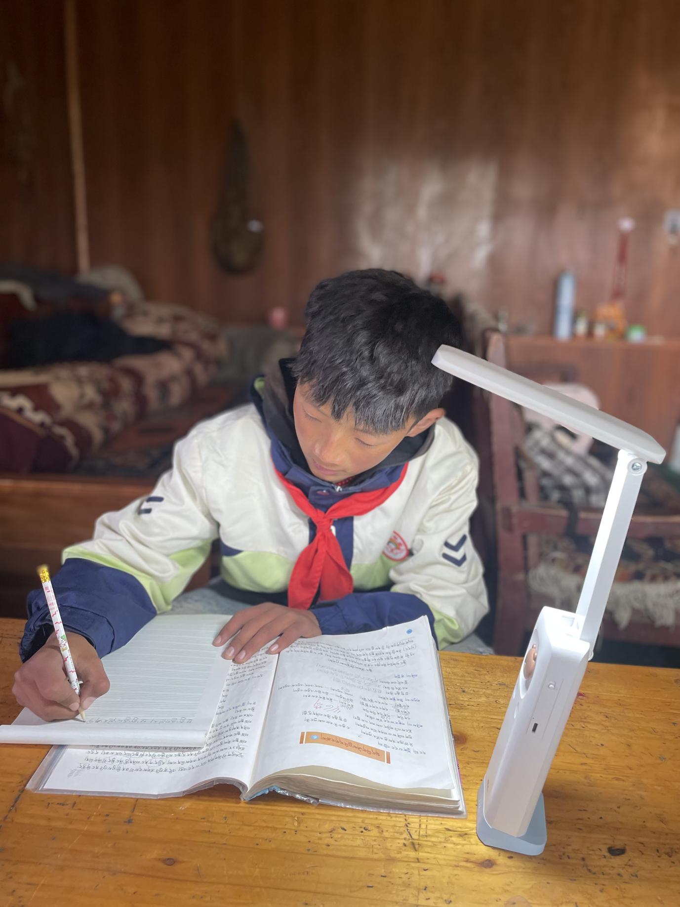 志愿者们带来的专业护眼台灯被安放在桌角。灯光亮起时,一直蜷在柴堆里的小狗突然窜出,兴奋地追逐自己忽长忽短的影子,大家都笑了。一同送到的还有书籍、文具与过冬物资,它们与那盏台灯一起,构成一种超越照明本身、更完美的关怀。关乎过冬的温暖,关乎精神的给养,也关乎一个孩子对未来的基本准备。