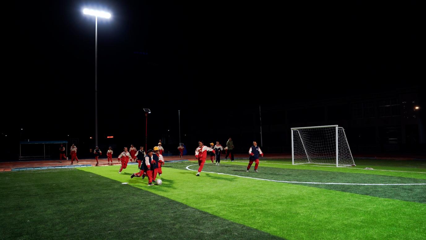 改变,随着“拾光计划”志愿者的到来而发生。傍晚,开关被郑重按下。高杆灯如蓄力已久的星群,骤然绽放在足球场上空。光落下的瞬间,欢呼与奔跑声炸开高原寂静的夜。扎西第一个冲进足球场,在明亮的灯光下奔跑、带球、射门,汗水在光晕里闪着细碎的光。“以前只能白天踢一会儿,现在晚上也能踢了!”他喘着气,脸上的笑容比灯光更亮。
